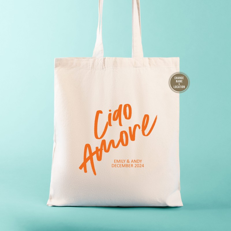 Evoke the warmth of Italian romance with our 'Ciao Amore' destination wedding welcome bags. Designed to add a truly Italian touch to your wedding festivities, these totes can be adorned with the names of the bride and groom and the wedding date, making each one a cherished memento. Picture your guests arriving and receiving a bag that's not only practical but filled with the promise of Italian charm and the celebration of love.