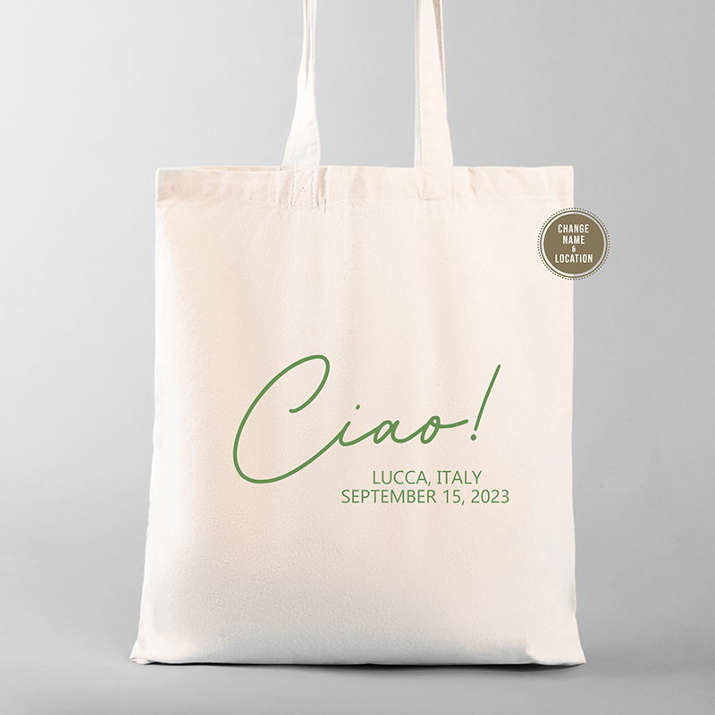 Celebrate your Italian destination wedding with our Ciao Tote Gift Bags, the perfect welcome gift for the guests. These bags are not just for utility; they're designed to reflect the warmth and beauty of Italy - to complement your special celebration in the most romantic place in the World. Customize each tote according to the theme of your wedding, and offer a piece of Italian charm that your guests can carry with them. With these gift bags, your guests don't just come for your Italian wedding, but take a piece of Italy back with them that lingers with them forever.
