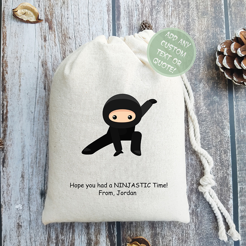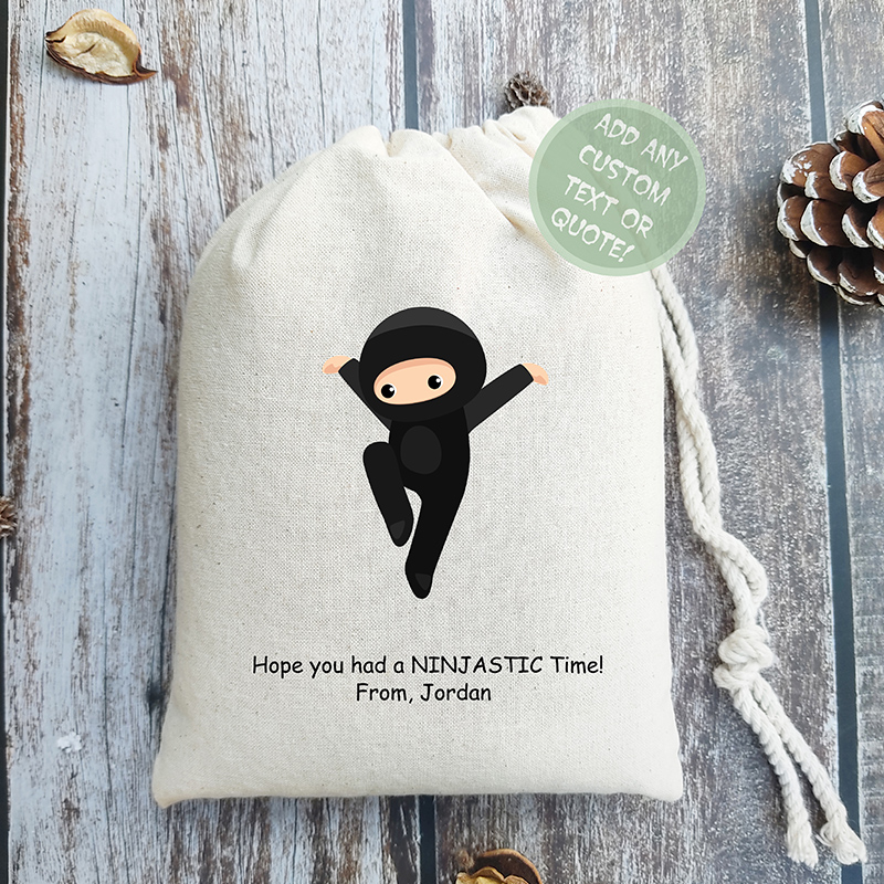 Celebrate your child's birthday with our exciting ninja-themed favor bags, perfect for adding a touch of adventure to any party. Each bag can be personalized with names, dates, or a special message, making them a unique gift for guests. Featuring a playful ninja design, these bags are sure to captivate and delight both kids and parents alike. Ideal for packing treats or small toys, they make for the perfect takeaway from your unforgettable celebration.