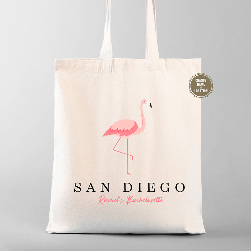 Prepare for a San Diego bachelorette party that’s as vibrant as a flamingo under the California sun with our bachelorette party totebags. Each tote is a canvas ready to be adorned with the details of your special occasion — perfect for a bridesmaid gift or a thoughtful welcome for wedding guests. Featuring a charming flamingo set against a crisp San Diego backdrop, these totes are your key to a memorable, sun-filled festivity. Customize with names and dates, and create a stylish and functional keepsake that your bridal party will adore long after the wedding toasts are done.